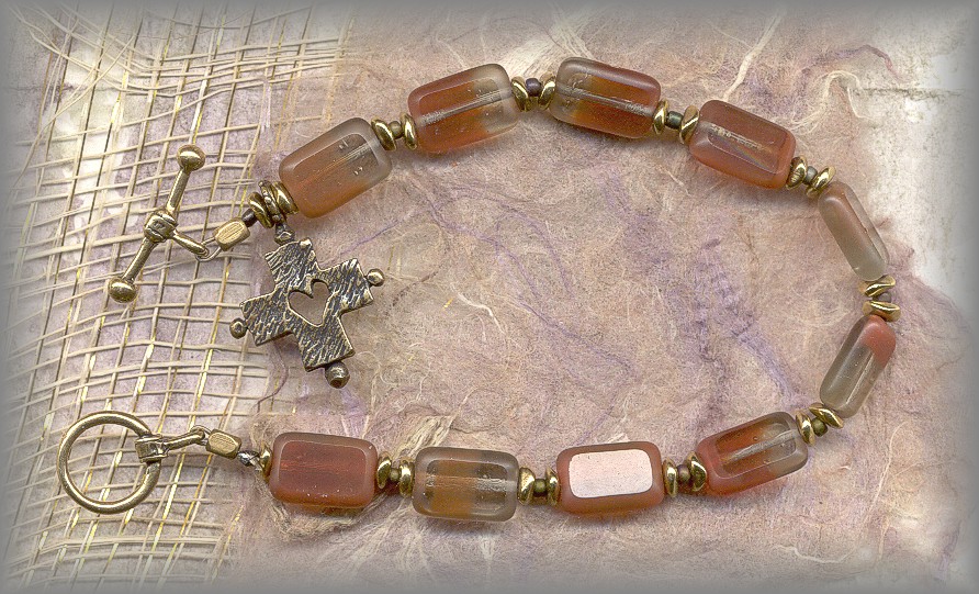 (click icons for larger images) + LEFT: Crystal with coral inclusions. CENTER: Antiqued silver rosebuds with green glass leaves shine between each bud. RIGHT: Faceted Pietersite hearts. BRACELETS |