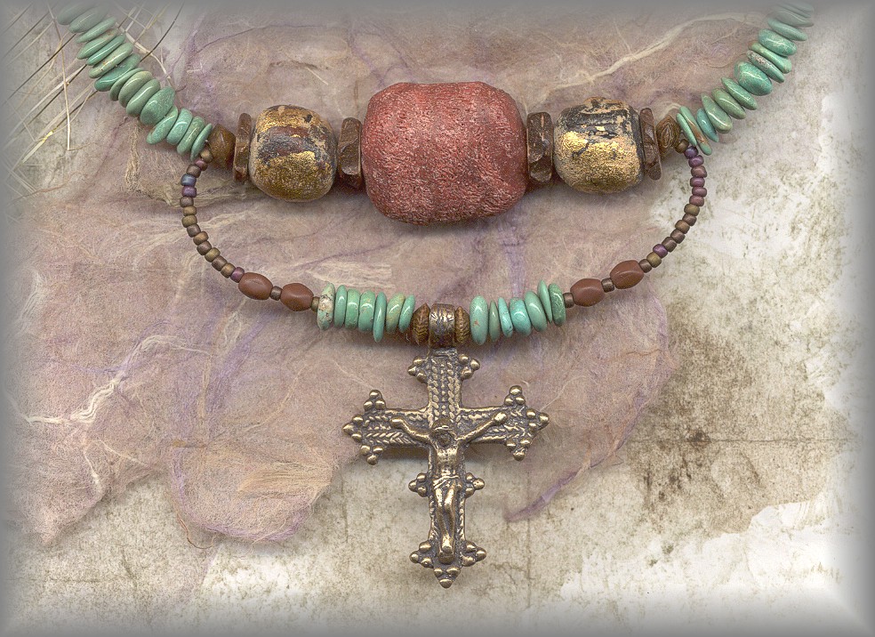 AntiqueJesuit crucifix (1700s or before) found at an archival dig at an old Jesuit Mission site (Mohawk Valley) Now available on 3 bronze chains and in 4 colors (blue, topaz, rose, jet. - 26 in.). For more information see link below: