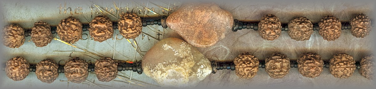 + PATERS ARE A NATURAL VARIEGATED 'PINK AGATE', FLAT LIKE A PEBBLE, WORN TO A MATTE FINISH. THIS STONE WAS MADE FOR PRAYER IN THE HAND. + We look carefully at its heavy texture and must say to ourselves that it is a powerful bead for prayer - certainly more sacrificial! Certainly it would keep one awake with its rough surface - until the prescribed prayers are completed. And of course, the goal would be to wear each bead smooth from many prayers! We have seen this done on a Christian rosary made of Rudraksha seeds (See Museum) and it gives one a sense of being near a sacramental that belonged to a very holy person. for more information see ROSARY + MORE LINKS SHOPPING CART |