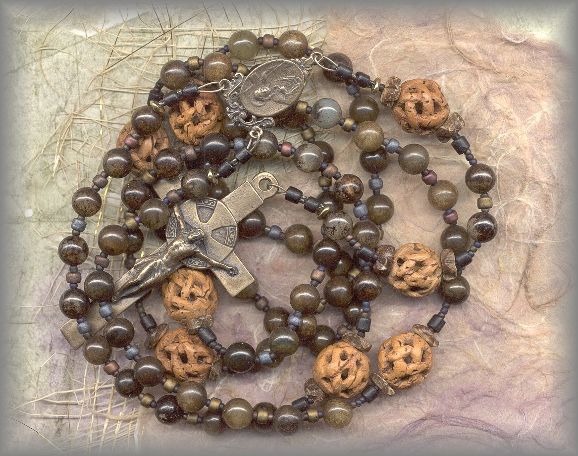 + AVE BEEADS: 8 mm, mixed shades of natural jade. PATER BEADS: Hand carved fruit pits compliment the Jade + HISTORY OF SEVEN JOYS Rosary consisting of seven decades in commemoration of the seven joys of the Blessed Virgin (1. the Annunciation, 2. Visitation, 3. Birth of our Lord, 4. Adoration of the Magi, 5. Finding of the Child Jesus in the Temple, 6. the Resurrection of Our Lord, and the 7. Assumption of the Blessed Virgin and her Coronation in heaven), in use among the members of the three orders of St. Francis. + ALL METAL PARTS Available individually from our parts catalogue . See full collection in solid bronze, sterling silver and new: white bronze. All hand cast from antique and vintage pieces. See SUPPLIES link above. |